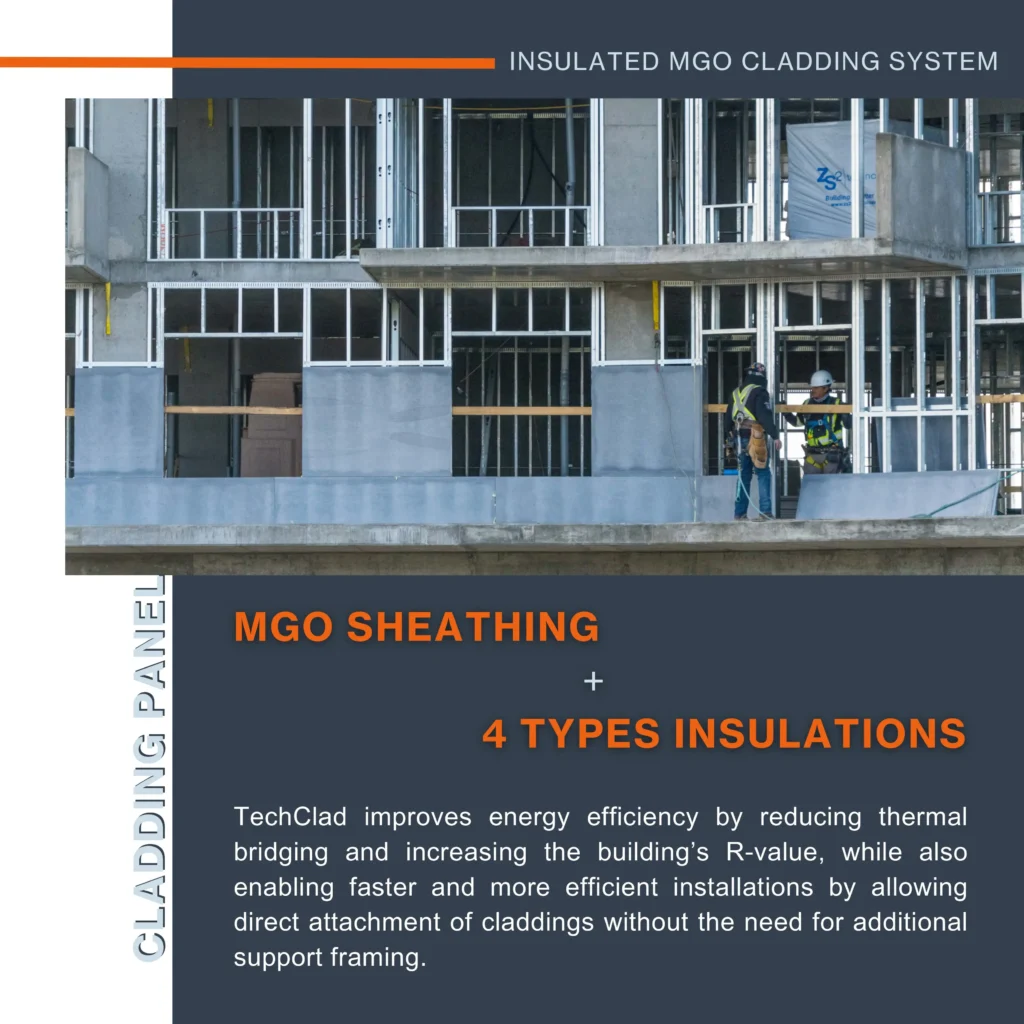 Enhance the performance of any new or existing build with TechClad—a prefabricated insulated sheathing system. As part of the building envelope, TechClad provides a comprehensive cladding solution designed to enhance thermal performance, fire protection, and structural integrity. This versatile system integrates magnesium oxide (MgO) sheathing with a variety of insulation options, allowing it to meet the specific needs of any project.