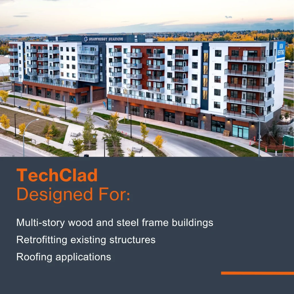 TechClad improves energy efficiency by reducing thermal bridging and increasing the building’s R-value, while also enabling faster and more efficient installations by allowing direct attachment of claddings without the need for additional support framing. Its robust composition not only provides superior protection from external elements but also contributes to sustainable building practices by minimizing material waste and labor time on site.